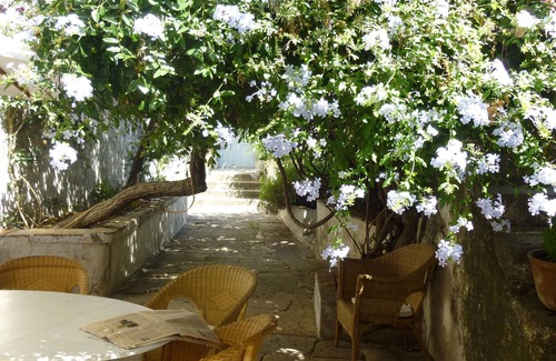 This is a beautiful, 4 BR mansion house furnished in the style of the Eastern Aegean, with quality furniture and oriental rugs throughout. It stands out for its gardens (front and rear ), with mandarin and yellow prune trees – one of the largest gardens in Chora. Located in the heart of the Medieval settlement, the property enjoys unique views of the adjacent 17th Century monastery and the sea beyond.