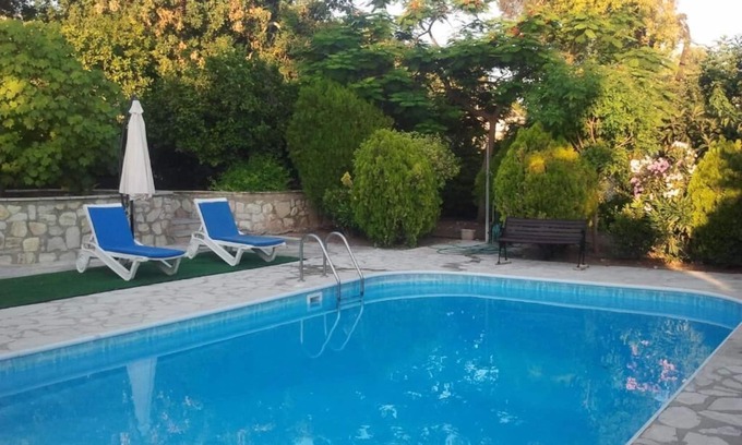 Large house with two double bedrooms with en suite bathrooms and convertible double sofa bed in living room area. Outside area consists of a large shaded terrace and a 9x5 meter deep pool. Landscaped gardens with fruit trees around the house