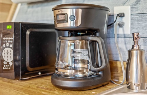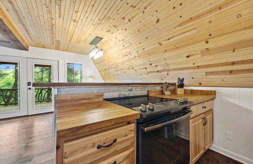 Outside, you'll be greeted by an incredible view of the creek, with a ton of outdoor deck space to relax and enjoy it from. The deck features a small fire pit perfect for roasting marshmallows and creating memories. There are outdoor dining spaces and a gas grill for al fresco dining while enjoying the stunning scenery. The highlight of the outdoor space is the hot tub, which can fit up to 6 people, offering the perfect way to unwind and take in the breathtaking views. Additionally, there's a creek overlook down below the house, providing an even more intimate connection with nature. Please note the path to the creek has not been cleared so unfortunately we do not have direct access to the creek at this time for our guests.