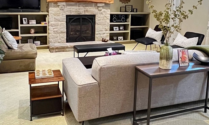 This rural 1870's farmhouse lower-level apartment, with separate access, has been fully renovated & furnished. Ideal for a quiet getaway or short-term stay. High-speed fiber wi-fi is included allowing you to work away from the office. It has a galley kitchen, 1 king bed bedroom, 1 double bed bedroom, 3-piece bathroom, spacious living room, workspace & eating areas, natural gas fireplace, in-suite washer & dryer.