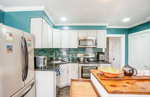 KITCHEN: Refrigerator, Keurig coffee maker, stove/oven, microwave, air fryer, kitchen island, dishwasher, dishware & flatware, cooking basics
