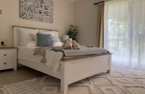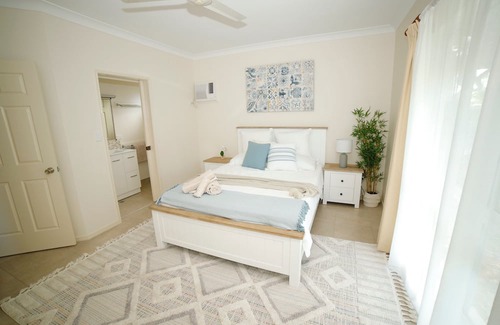 Experience North Queensland's tropical oasis amongst this free-standing home in Townsville. Enter the front door to discover spacious open-plan living embellished with artwork and modern decor. Kick back and watch movies on the 60” Smart TV or connect your phone to the Bluetooth to upload the latest Netflix entertainment. Sliding glass doors flood the house with natural light, opening onto a private patio and rear garden showing off Mt Stuart in the background. The kitchen is fully equipped, fit with premium appliances and complimentary menu staples. Choose from two eating areas either inside at the six-seat dining table or for a more casual affair gather together around the outdoor table and BBQ as a group.