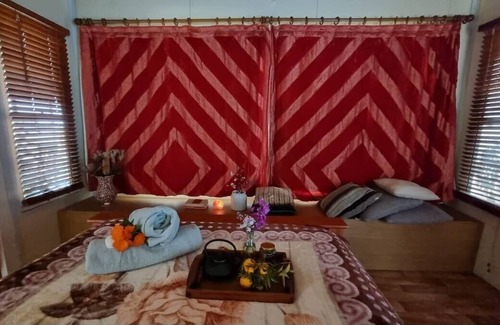 Private getaway with 3 sleeping quarters plus loft. Can accommodate up to 6 people, queen and king single beds. Fit for a couple or family getaway. Indoor fireplace, shower, bath, kitchen and modern comforts. Own panoramic views over Spirabo mountain and lush gardens surrounding the cottage.