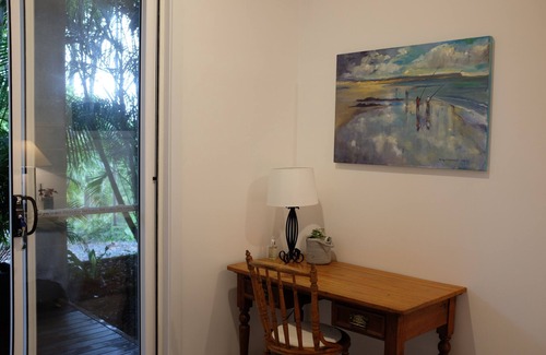 The apartment includes iron, ironing board, clothes drying rack, hairdryer, fire alarms, fire extinguisher, torches, board games, cards, new large flat screen TV with Chromecast. There is no stove/oven but the kitchennette includes tea/coffee, sugar, milk, fridge, dishwasher, microwave, toaster, plunger coffee pot, kettle, all new crockery, cutlery, glasses and utensils. There is a private outside deck area overlooking garden and rainforest views. Laundry facilities available for those on longer stays. There is a gas bbq on your deck .Beach towels supplied.