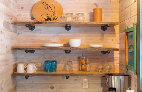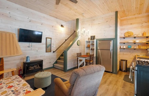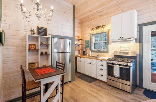 Step inside the cottage and be captivated by its rustic charm, featuring warm pine interior walls that exude coziness, a clever flip-down built-in table nook ideal for leisurely meals, soaring ceilings that create an airy feel, and a charming gas fireplace that welcomes you with its flickering glow. The inviting kitchen area is ready for your culinary adventures, complete with a full gas range for on-site cooking, or fire up the charcoal grill for delightful steak dinners under the stars.