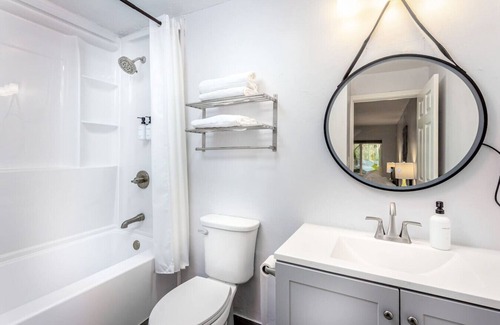 Please note that here is a steep step when exiting the bathtub/shower. Guests with mobility concerns should exercise caution.
