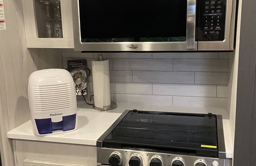 Modern 2022 RV located on a tranquil, park-like property, fully equipped kitchen to prepare your own meals, living room with tv, satellite internet, amazon firestik, dining area, master king bedroom with large closet and washer/dryer combo. Bedding, linen provided.