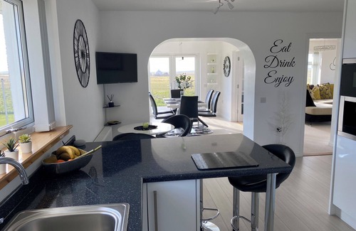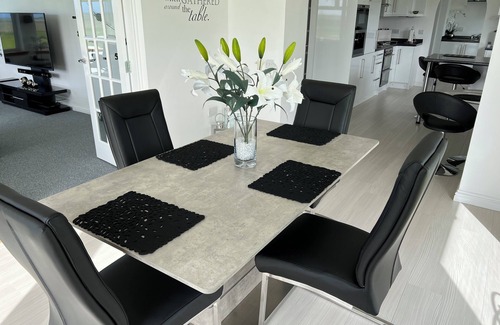 Tranquil Sands self catering holiday home comprises of a Utility Room, Kitchen, Dining Room, Lounge, Family Bathroom, Two Bedrooms (one of which has an en suite walk in shower), Fibre Optic Broadband, Wi Fi and Sky Q, an Integral Garage with Remote Controlled Opening, a Large Parking Area and a South Facing Patio Area. Our Bungalow offers beautiful open uninterrupted views and is within walking distance to an unspoilt beach. Our garden is fully enclosed and is ideal for dogs.