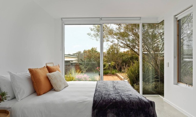 You’ll rest easy in each of the three bedrooms, with black-out blinds and hotel-quality linens. The primary bedroom opens straight to the garden and comes with a queen-sized bed and a gorgeous ensuite bathroom, with a walk-in shower. The second bedroom also comes with a queen-sized bed, while the third bedroom has a combination bunk bed, ideal for those travelling with kids. Refresh within the neat main bathroom or rinse off after a day at the beach in the outdoor shower. You’ll also find private laundry facilities, adding to your everyday convenience.