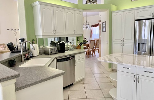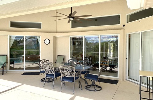 Open floor plan, Feel like you’re on Vacation everyday. Located on a beautiful canal with tons of opportunities for bird watching. Large master bath with spacious walk in shower and soaker tub, fully equipped with everything you need. You will feel totally relaxed while enjoying the hot tub or the pool and listening to the waterfall. High ceilings in most of the house will give you that open plan and all the space you need. There is access to the pool area from 3 parts of the house including from the main bedroom. There is a pool bath and an outdoor shower which is great when returning from the beach. WeberGrill is available for a cookout. For the Golfers we have five golf courses in our community all within three to ten minute drive. Amazing beaches restaurants very close to the house.Area is a vibrant beach town with activities and events going on all the time within a short drive. Area has many walking and biking trails within the community. Beach chairs, towels, umbrellas , bikes, fishing poles, coolers, and other items are stored in the garage for your use. House has a new pool/ spa heater ( pool heated for an additional fee.) The Primary’s suite is separated from guest bedrooms for extra privacy. House is also equipped with a desk and chair combined with great high speed internet make a great remote work spot. The community also has a park with tennis and pickle ball courts for your use. Just a ten minute walk or two minute drive. In summary ,like the name of our house says, Tranquility is what makes you happy, we just give you choices. 🌴🎉😁