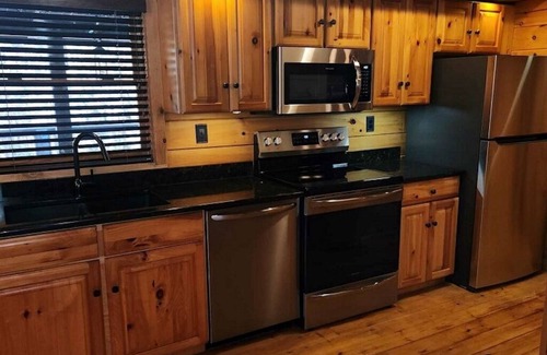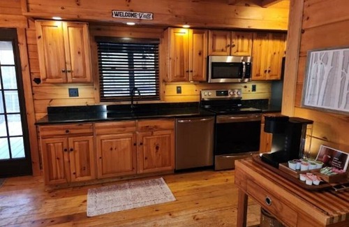 Traveler's Rest has the comforts of your own home, just bring your suitcase. Whether you're here for vacation, a quiet getaway, a wedding, or work, Traveler's Rest Cabin gives you all the amenities to make yourself feel at home. The cabin can sleep up to 6 people, so bring the whole family! Included is a full kitchen with all the utensils and appliances, (refrigerator with ice maker), for a home cooked meal, a charcoal Hibachi grill, an inviting concrete and stone fire pit and a large porch for sipping your morning coffee or hot cocoa. Traveler's Rest Cabin is ready for you to come, relax, and enjoy yourself!