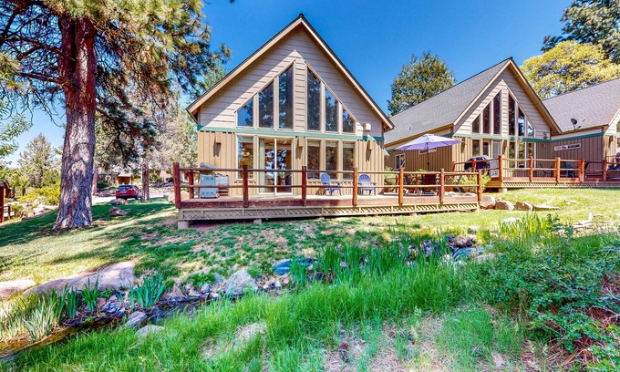 Tree-lined cabin with large deck, pool, hot tub, & fireplace - dog-friendly is located in Klamath Falls. Tree-lined cabin with large deck, pool, hot tub, & fireplace - dog-friendly provides accommodation, featuring Balcony/Terrace, Security/Safety, Sports/Activities, among other amenities. This House features Balcony/Terrace, Security/Safety, Sports/Activities, to make your stay a comfortable one.