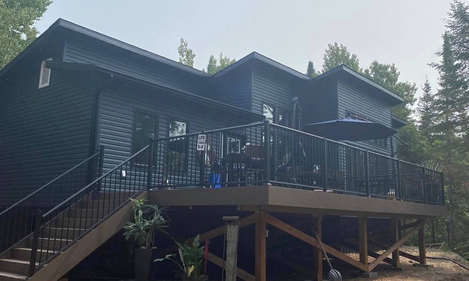 Built in 2023, 3 bedroom cottage with Mid century modern design is sure to make you feel at home in the trees! Take the nature path to the private dock, spend the day at the community beach, or snowmobile and ice fish the winter away. Wifi included, air conditioning, heat, outdoor fire pit area, huge private deck and dock on the water (water is a 5-7min walk from cottage on a beautifully treed path) For the summer months, enjoy the fresh smell and sounds of the water as you sit and soak up the sun on the PRIVATE WATERFRONT Dock (5-7 min walk from cottage). Hop in for a swim or bring the bait and fish right off the dock. Have a round of golf at spectacular Granite Hills or Black Bear golf course. Spend winter days snowmobiling groomed trails. A wonderful relaxing time awaits for you, you will be welcomed by the trees by day and stars at night.