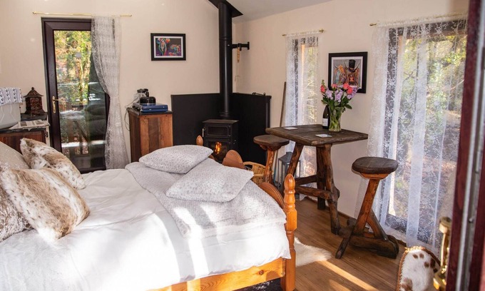 A secluded and intimate farm stay, this eco-friendly treehouse offers a peaceful off-grid escape for two guests and their furry companions. Surrounded by woodlands and perched above a private lake, it features a cozy interior with a double bed, soft furnishings, and a charming log-burning stove—ideal for a romantic, nature-filled getaway. The pet-friendly retreat welcomes dogs, making it perfect for couples who want to unwind in a tranquil setting while exploring nearby pet-friendly woodland trails. Guests can also enjoy outdoor moments on the private balcony or by the lake with exclusive access to a summerhouse and rowing boat. Tucked away in the unspoilt countryside of Germansweek, this hideaway is ideal for those seeking total seclusion while still being within reach of rural attractions. Nearby Dartmoor National Park offers endless hiking opportunities and breathtaking views, and the quiet surrounding lanes and forests invite leisurely walks and wildlife watching. For essentials or a local meal, quaint Devon villages with welcoming pubs and small shops are a short drive away. This peaceful location makes it a great choice for outdoor-loving guests looking for privacy and immersion in nature. Inside, the treehouse is equipped with thoughtful eco-conscious amenities including a two-ring gas stove, cooking utensils, and fresh water via a bowser. While there’s no shower, a private, eco-friendly sawdust toilet adds to the rustic charm. Bed linen is provided, and guests may rent an ice box for convenience. The log-burner adds a warm, luxurious touch for evenings spent indoors, rounding off a serene and memorable countryside retreat.