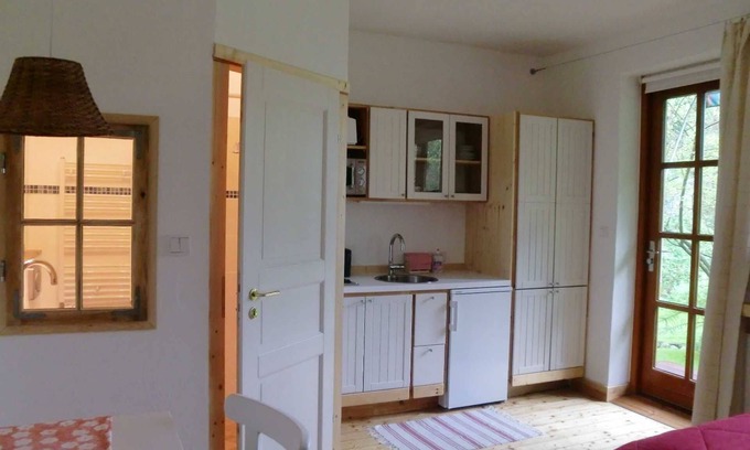 The apartment, sorry, that room is located in the main house where we live itself. It has a separate entrance, which is reached by a small terrace from the garden. It's always the way Rose room because before the large windows are some wonderful roses, during the flowering fulfilled their fragrance throughout the room. The bright, located to the southwest room is about 20 square meters and is decorated predominantly white. The large windows and glazed door to the floor let in plenty of light, but you can lock out with existing blinds. In summer, the area is nice and cool due to the large roof overhang. The small bathroom is equipped with shower, toilet and wash basin. A fan provides the necessary deduction system and underfloor heating for warmth. The small kitchen is well equipped with round sink, 2 burner ceramic hob, fridge and microwave with grill. Of course, the kitchen is fully equipped. Under the relatively high French bed (1.40 m wide and 2.00 m long) you can stow their bags in a large bed box. This cozy bed will give them wonderful dreams and when you wake up in the morning, you have an unobstructed view of the countryside. Oh, and before her room ripples in the summer a small stream direction swimming pond.