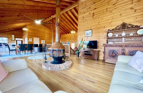 Step inside to an expansive open-plan living area where natural timbers and a striking circular fireplace create a warm, inviting atmosphere. This main lounge features comfortable seating and a Smart TVperfect for relaxing after a day exploring. Down a few steps, a second sunken mezzanine lounge adjoins the bedroom wing. This cosy space offers another Smart TV, along with a DVD player and a curated collection of films, making it a great retreat for kids or a quiet movie night.
