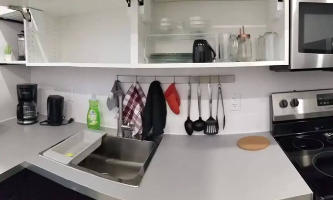 All new appliances: full size fridge, stove, dishwasher, microwave, toaster, kettle, pots/pans, utensils, plates/cups, coffee maker