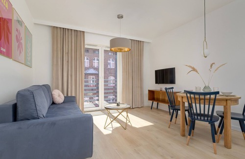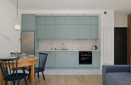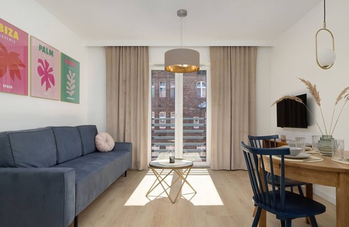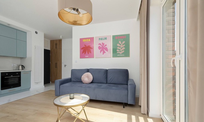 This trendy and bright flat offers accommodation for 4 people. The living area consists of a beautiful living room with a comfortable sofa bed, combined with a well-equipped kitchenette and a stylish bathroom with shower. It is the perfect choice for a couple or family getaway in Katowice. Decorations and furnishings in line with the latest trends give the place an amazing atmosphere. The flat will certainly appeal to even the most demanding travellers. The pastel colour palette enriched with subtle accessories gives the flat an extremely pleasant character. Guests have full freedom to prepare tasty meals, thanks to the kitchen equipment (induction hob, kettle, oven) and enjoy them at the communal table. Multimedia facilities are provided - a TV with SmartTV and free Wi-Fi internet connection. The flat is stocked with the basics necessary for a successful holiday. A complimentary toiletries kit (soap, shampoo and shower gel), towels and bed linen are provided to facilitate the start of each stay. In addition, the flat comes with a private parking space in the outdoor car park.