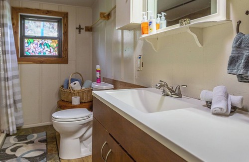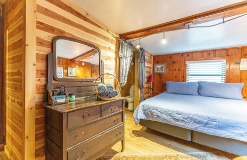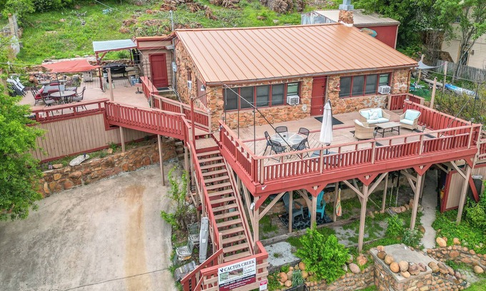 Step into our cozy cabin and feel the stress melt away. With rustic charm and modern comforts, our 80 year old spacious retreat is perfect for group getaways and family fun. Lounge on the massive deck with stunning views of Mount Scott, or fire up the grill for a barbecue. Inside, you'll find room for everyone, plus a fully equipped kitchen for homemade meals. After a day of adventure, retreat to plush beds for a restful sleep. Don't miss out on the lively music events and festivals downtown, just a stone's throw away. With ample parking and easy access to outdoor activities, and the charm of downtown Medicine Park, Oklahoma.