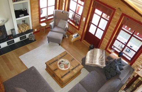 "Troll", 6-room house 95 m2 on 2 levels. Living/sleeping room with 1 sofabed, Scandinavian wood stove, dining table, satellite TV, international TV channels, CD-player and DVD. Exit to the terrace. 1 room with 1 double bed (150 cm, length 200 cm). 1 room with 3 sleeping facilities (120 cm). Open kitchen (oven, dishwasher, 4 ceramic glass hob hotplates, kettle, freezer, grill, electric coffee machine). Shower/WC, Sauna. Upper floor: living/sleeping room with 1 double sofabed (150 cm, length 200 cm), satellite TV, international TV channels and DVD. 1 room with 1 bed (80 cm, length 200 cm). 1 room with 1 bed (80 cm, length 200 cm). Electric heating. Box-room. View of the lake. Facilities: washing machine, baby cot. Please note: non-smoking house. Smoke alarm, fire extinguisher. Freezer approx. 65 l. Bed layout is flexible. There are more sleeping options available than the maximum number of people allowed which may, however, not be exceeded. 924531169