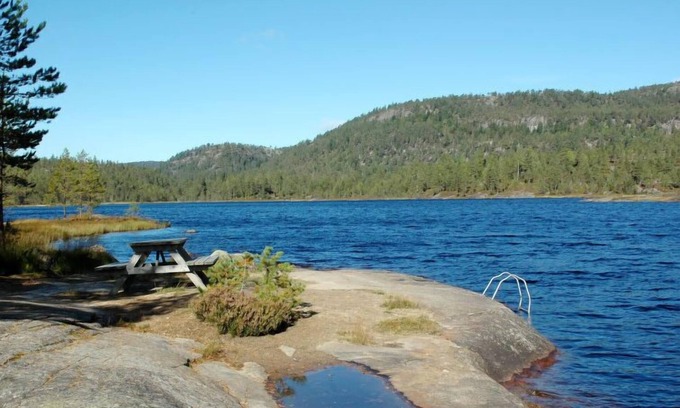 Holiday development "Troll". 5 km from the centre of Felle, 55 km from the centre of Kragerø, 141 km from the centre of Kristiansand, 150 m from the lake. Bathing place. Private: natural state property. Terrace, garden furniture, barbecue. Available: canoe (extra). Parking on the premises. Shop 5 km, supermarket 20 km, ferry "Langesund" 79 km, sandy beach 1 km, rocky beach 500 m. Fishing possibilities 150 m. Hiking paths: Eikhom 30 km.