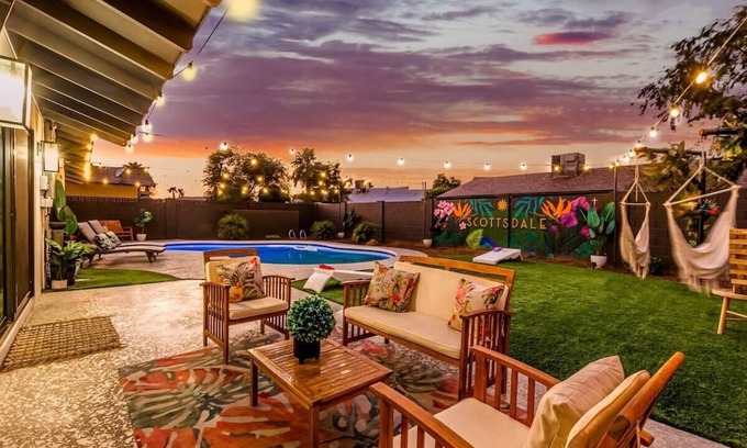 Welcome to Tropic Oasis by Scottsdale Beach Club! This newly remodeled ranch-style home is in a convenient, centralized Scottsdale location. Enjoy the backyard with a view of the famous Camelback mountain from the hammock swings, while lounging underneath the twinkling string lights. Watch the game on our outdoor TV while grilling, or lounge by the sparkling pool. Pose for an epic IG photo next to the custom “Scottsdale” Mural. Inside, enjoy the massive common area!