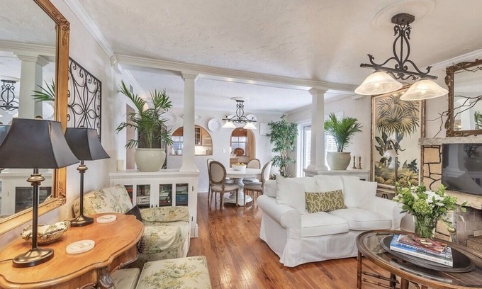 Every corner exudes character, from the gracefully appointed floral furniture to the carefully curated antique accents, nestled in the heart of West Palm Beach's historic Antique Row. Whether you're relaxing by the coquina fireplace or unwinding, this home offers a unique blend of historical charm and floral beauty. It's a small retreat brimming with character, inviting you to experience it's enchanting, nostalgic allure.