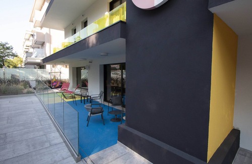 The suite is conceived as two separate environments that share the same pop aesthetic: the Living / CLUB entrance area and the Sleeping / RELAX area. The first, characterized by intense colors and industrial materials, primarily tiles and sheet metal, is inspired by the historic clubs of the Rimini nightlife. The kitchenette, transformed into a real corner bar, makes the room, the most "social" of the room, open to the city, the perfect location for organizing parties and small events. The iconic furnishings in intense colors blend well with the tropical setting of the two terraces.