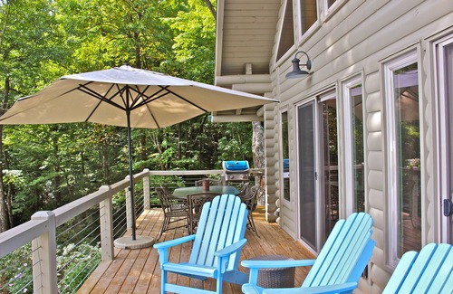 Contemporary wooden A-frame log cabin with wooden beams over exposed 2 story ceiling. 35 mile unspoiled view at 3000 ft on Indian Camp Mountain, this 3 BR/3 BT 2400 sq ft. sanctuary on 7 acres is close to walking trails, hiking, biking, and 14 miles to Brevard. New/updated bathrooms, fully furnished kitchen, large open & covered decks, firepit, fireplace, soaring walls of glass,gas grill, new HVAC & water heater. 1 Step to main level. One bedroom and full bath on each level. Due to the higher altitude, mosquitos aren't even a problem in the summer months.