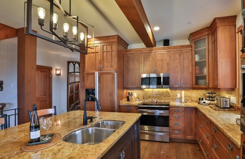 The living space boasts of a bright and open concept in all areas. The beautiful wood floor is from a reclaimed sunken ship! It has a HUGE gourmet kitchen that has a built-in coffee machine, a wine fridge, new appliances, a large heated island top, and every small appliance & accessory you could want. All kitchen necessities are provided including spices, cooking oils, teas, and hot chocolate. There is also a full second kitchen downstairs by the bar in the games room. The dining table has expandable seats for up to 16 people.