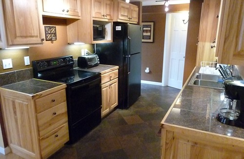 Fully equipped kitchen with granite counter tops, a full-size glass top stove/oven, full sized refrigerator and full sized dishwasher. An abundance of cookware and utensils for meal preparation and serving.