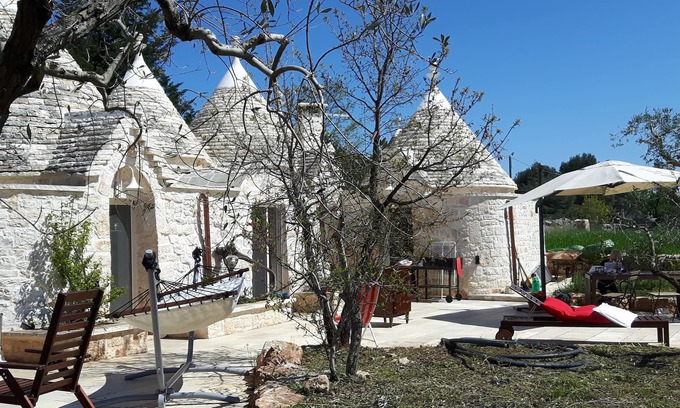The construction consists of a double and a French double bed (bed size 140x190) both with bathroom, an alcove with sofa bed, kitchenette with dishwasher, induction hob, oven and washing machine. bathroom towels, bed linen and dishes are present in the structure. Large living room overlooking the garden. patio overlooking the property of about 2000 square meters with trees free parking, barbecue. The structure is equipped with safe and drinking water alarm system. It also has wi-fi in some rooms and an outdoor 3x8 m swimming pool with 2 sunbeds and umbrella and barbecue. There is no heating, except in the bathrooms, and air conditioning (the trulli are notoriously cool in summer)