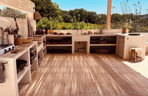 Outside of the kitchen is a long table with 2 wooden benches either side. Nearby to the outdoor kitchen is a long stone bench with cushions and table in front just perfect for snacks and enjoying a glass of wine.