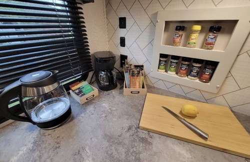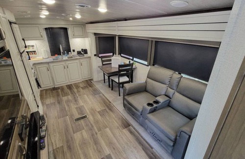Cozy, yet very roomy and comfortable. The kitchen is a unique design for an RV, allowing lots of counter and cupboard space. The comfortable recliners are heated and include a massage function. The HD LCD TV has a Roku with Netflix included. You're welcome to log in to any other service you subscribe to.