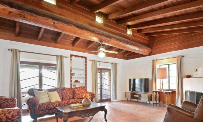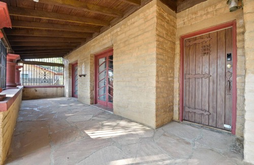 This charming home showcases rustic adobe-style architecture with wood-beamed ceilings and warm terracotta flooring. Begin your morning with fresh air and a quiet coffee on the patio. From there, the day is yours—explore nearby attractions or browse local shops. After a day of adventures, return home to unwind with a friendly game of pool in the basement or a movie in the comfortable living room. Every moment here is yours to enjoy!