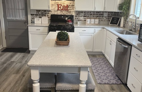The spacious kitchen is newly remodeled with a large island with granite countertops and seating. Gas stove with built-in griddle on the range top and a Dining room table can seat up to 8 people.