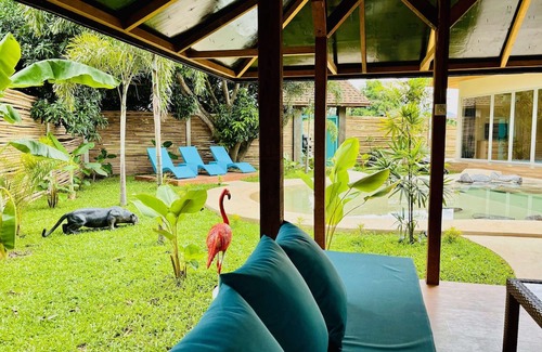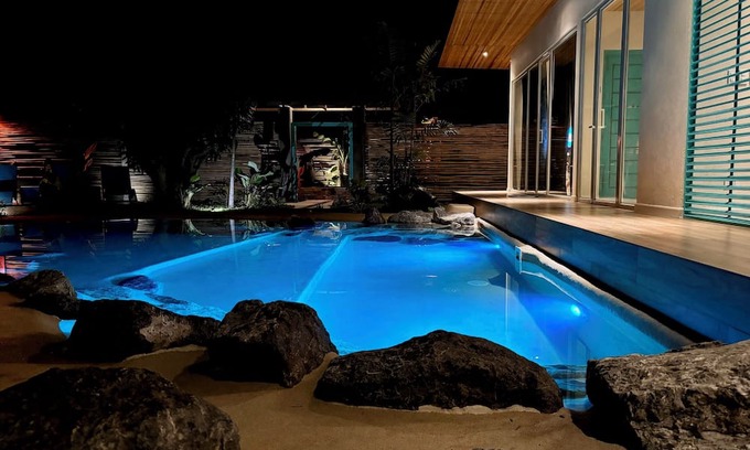 Escape to Turquoise Tide Villa, a luxurious retreat designed to accommodate up to 14 guests. This private paradise offers an exclusive beach-style pool, a hot jacuzzi, and a relaxing outdoor living area, blending comfort with exotic charm for an unforgettable stay.