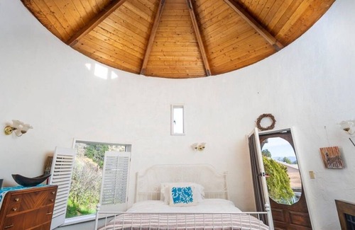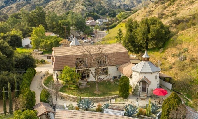 If you are looking for a unique architectural experience you have found it in our Delwood Turret. An off the beaten path location in Val Verde, Ca. adjacent to Castaic, 10 minutes to Santa Clarita. This is a 200 square foot round room with a steeple, King size bed, private bathroom, a long hallway with a love seat, refrigerator, coffee maker and microwave. Private entrance inside a European style farmhouse.