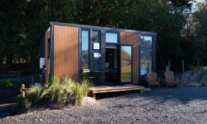It's a cozy 139-square-foot tiny home and pet-friendly accommodation with easy access to water, split air conditioning, a kitchenette, cooking equipment, and excellent bathroom facilities. These amenities include an eco-friendly cassette toilet with a removable waste holding tank, hand basin, and shower (gas-heated for hot showers).