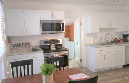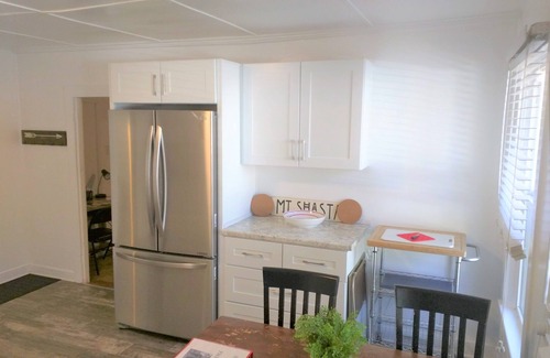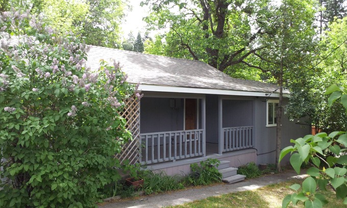 TWIN OAKS - Rustic charm with smarthome conveniences! This quiet, beautifully secluded property is located 1 block off Mt. Shasta blvd. Within walking distance from restaurants, shopping, movies. 3 miles from Lake Siskiyou & golf. 12 miles from Mt. Shasta Ski Park. This two bedroom property sleeps 6. It has a brand new modern kitchen, master bedroom w/ full bed, second bedroom with two twin beds, new bathroom fixtures, living room w/ pull-out sofa bed & futon, laundry room and large front porch.