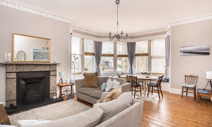 Scott's View Apartment is a stunning seaside holiday apartment, located right on the High Street in North Berwick. There are 2 bedrooms, kitchen and a sitting dining room. The wonderful large south facing bay window in the sitting room offers a sunny spot to watch the going's on in the High Street below and also has views to the sea beyond. This second floor apartment has high ceilings, original features and large picture windows and a wonderful period fire place.