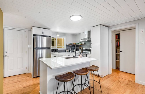 One of the cottages includes a well-equipped island kitchen with stainless steel appliances and counter seating, a dining area with a mid-century modern table and chairs for guests, and a comfortable living room with a sofa and TV for streaming your favorite channels.
