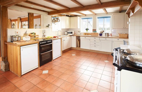 Inside the main house there's plenty of room to spread out with a large L-shaped sitting room divided by beams, giving separate areas to relax whilst still being together. A large open fire warms the space and plenty of comfy seating is provided to enjoy it. Perfect for catering for large groups, the farmhouse kitchen has both an Aga and an electric oven and hob, and a small breakfast table. The room spills through into an enormous dining room, large enough to seat all 15 guests. One of the five bedrooms is downstairs, along with a shower room. The remaining four bedrooms are upstairs on the first floor; bedroom one enjoys its own en-suite, with a family bathroom servicing the remaining bedrooms.
