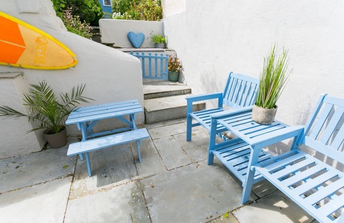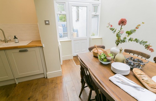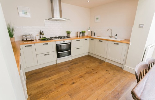 Step into Ty Medi and it has a cosy sitting room with a wood-fired stove. Through to the sociable kitchen and dining area, perfectly set up for cooking and leisurely dining. Throw open the french windows and step out onto the terraced verdant rear garden. Over the stone wall at the end of the garden is the 14th century Church of St Mary's and St Nicholas. You'll hear pealing from the bells from time to time, adding to the holiday vibe.