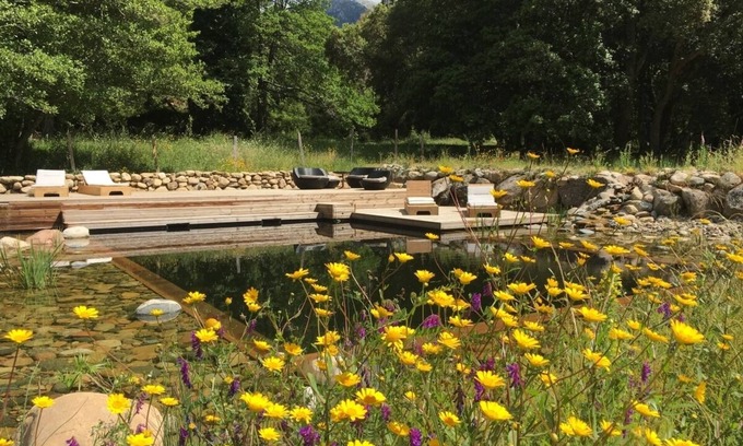 Between sea and mountain and in the shade of centuries-old oaks, they are ideally located in the heart of nature, on a plot of four hectares, with a large natural swimming pool (6X12m) accessible at all times just in front of the bungalows and with all the space necessary to walk on the property, relax and bathe in peace.
