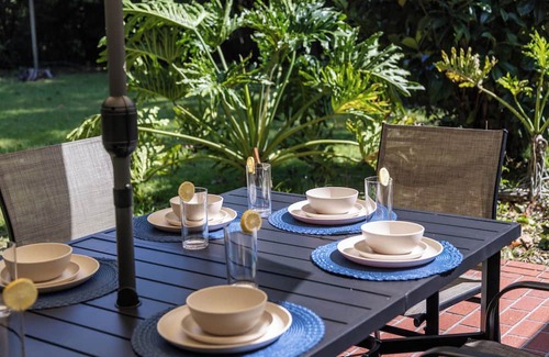 ▻ Our inviting porch area features an outdoor 8 person table with an umbrella for shade.