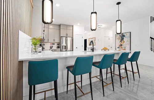Bright, chic, and light-filled, the open-plan living/dining space is the perfect prelude to this fabulous abode. White marbleized floors complement the bright and beautiful accent furnishings, including two cozy-chic orange couches facing two additional plush chairs. Transition from lounging to feasting at the sleek white table, which comfortably seats 10 in its glam teal and gray dining chairs.