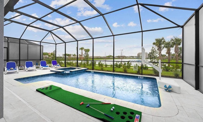 When the weather is right (basically always), pop open the patio door to your private outdoor oasis, featuring a crystal blue pool, comfy loungers, a patio table and chairs, and a grill. Shift the vibe from chilled to fired up with some friendly competition at the ping pong table, putting green, and poolside basketball hoop!
