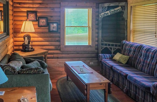 After a day of fun on 40 gorgeous acres, find sanctuary from the sun in the cabin's spacious living room. As you warm up by the wood-burning fireplace, you and your friends can lounge on the plush couches and watch the Colts game on the flat-screen cable TV. Firewood can be provided upon request.