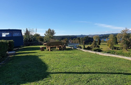 The 1970s bus has a double bed and is a great hang out space with tonnes of room to sit and play cards or have drinks